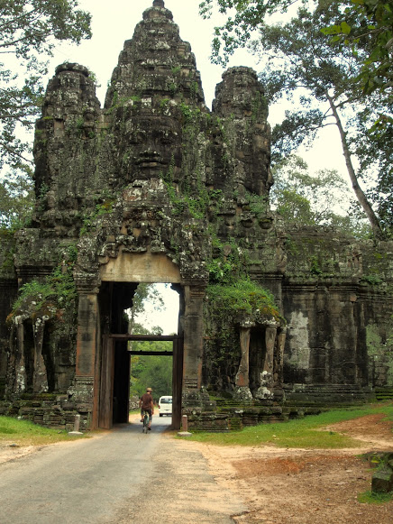 Biking through the east gate of Angkor Thom: