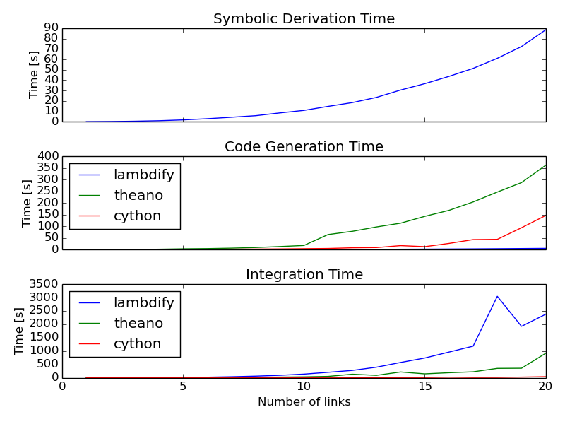 The print out shows the exact time values. For 1000 time steps of integration over 10 seconds of real time (100 hz) for the 20 link problem, the Cython method wins out at 39 seconds. Theano took 914 seconds (23x slower) and lambdify took 2374 seconds (60x slower). Cython was able to integrate the equations of motion for up to 17 links at real time speeds (9.5 seconds) for 100hz throughput. The timing was dependent on my system processes, so there are some blips. It'd be nice to get an average of this computation. You can run the benchmark yourself here: