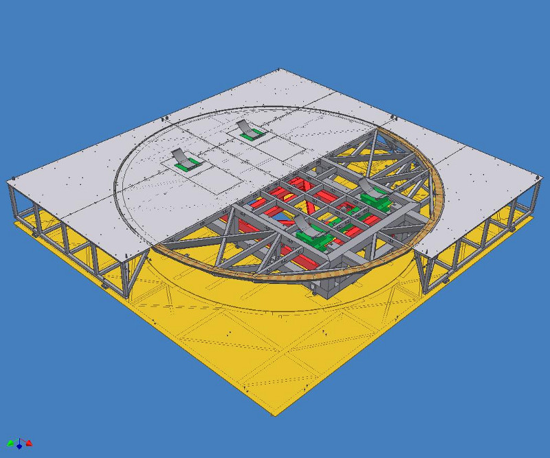 A CAD model rendering of the full final balance design mounted to the top of the 14' x 22' turn table system.